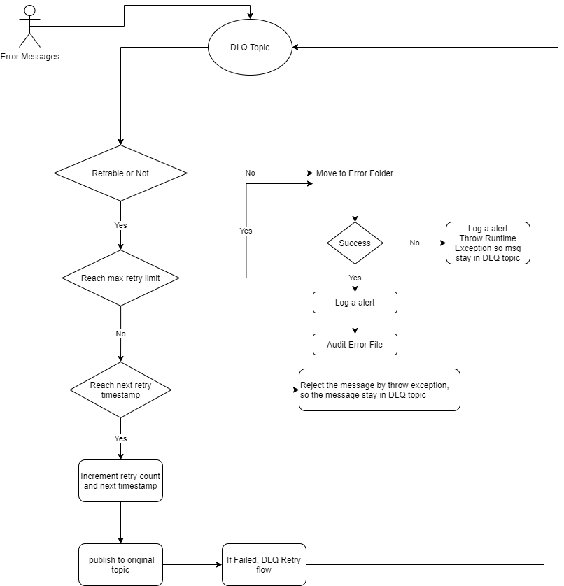 The (DLQ Service) will subscribe to DLQ topic when message arrived, the service will process the message. Here is flow diagram